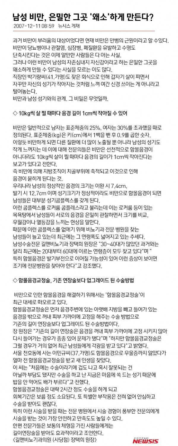 NO. 3 지점 작성일 2016.08.09 조회수 3,805 제목 남성비만, 은밀한 그곳 '왜소'하게 만든다? 관련링크 본문 2007년 12월 11일 뉴시스게제 이전글 다음글 목록보기